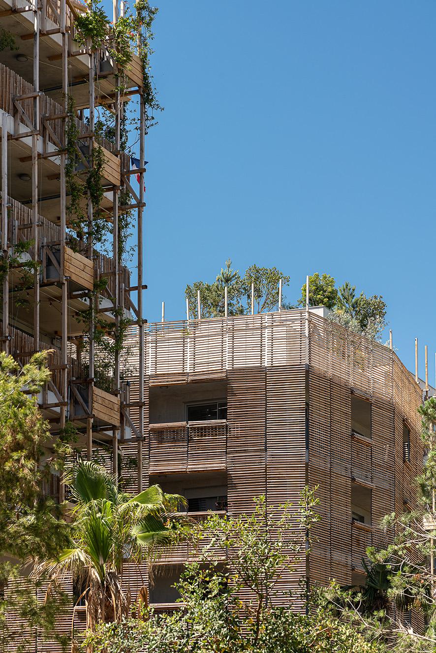 Nice Le Ray s’inspire du panorama méditerranéen. Il se caractérise par ses jardins en pleine terre et sur les toits, ainsi que par ses larges façades végétalisées ou habillées d’un bardage en bois durable. Les bâtiments ont été conçus pour créer une transition harmonieuse entre le tissu urbain de l’avenue Gorbella et le parc public de 3 hectares réalisé par la Ville de Nice. Certifié NF Habitat HQE et conforme à la démarche BDM (Bâtiments Durables Méditerranéens), Nice Le Ray est le plus grand projet immobilier à façades végétalisées d’Europe. Celles-ci contribuent, avec les nombreux espaces verts, à lutter contre les îlots de chaleur.